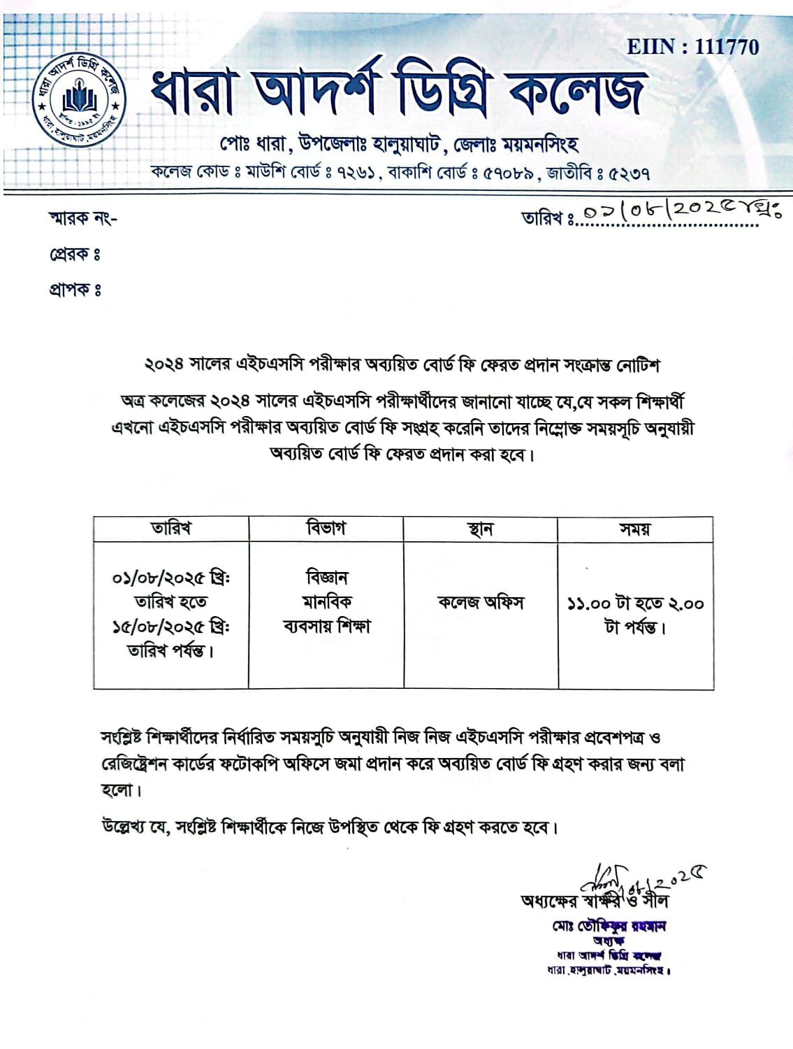 ২০২৪ সালের এইচএসসি পরীক্ষার্থীদের অব্যয়িত বোর্ড ফি ফেরত সংক্রান্ত বিজ্ঞপ্তি।